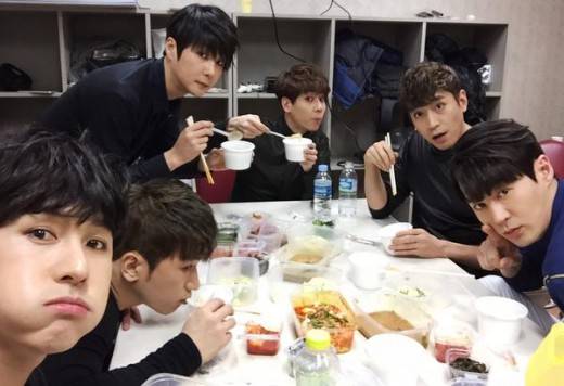 공개된 사진 속 신화 멤버 김동완, 이민우, 에릭, 앤디, 전진, 신혜성은 점심 식사 도중 카메라를 바라보고 있다.