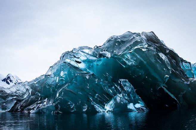 사진작가인 알렉스 코넬(Alex Cornell)이 촬영한 남극의 빙산이다. 남극의 얼음이나 빙산이라고 하면 보통 하얗고 큰 덩어리 같다는 느낌이 있을 것이다. 하지만 이 사진 속 얼음은 투명한 푸른색이다. 이 사진은 남극에서도 드문 것이다. 평소에서 차가운 바다 속에 숨어 있던 빙산 일부가 육지로 모습을 드러낸 것이라고. 빙산이 뒤집어지면서 눈 하나 쌓이지 않은 이런 장면이 연출된 것이다. 이런 이유로 마치 CG로 만든 것 같은 얼음을 담은 것이다.