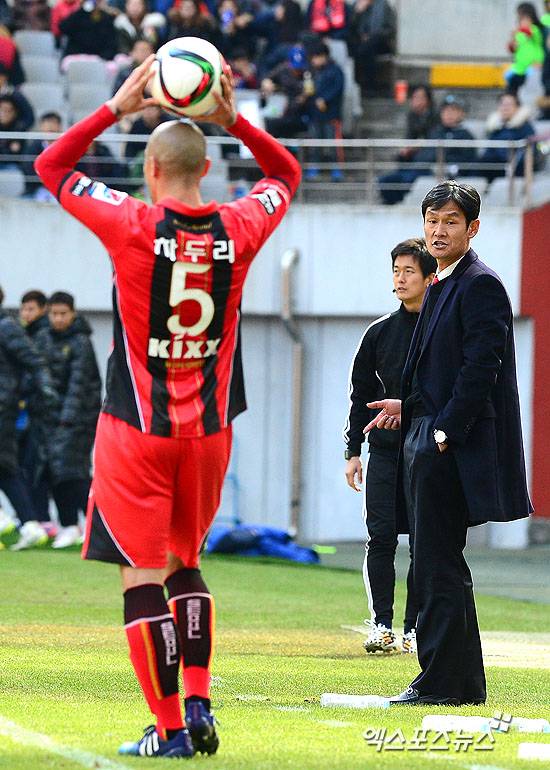 [엑스포츠뉴스=권태완 기자] 14일 오후 서울 상암동 서울월드컵경기장에서 열린 '2015 K리그 클래식' FC서울과 전북 현대 모터스의 경기에 서울 최용수 감독이 차두리에게 작전지시를 하고 있다.