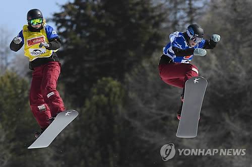 epa04662046 Sandra Daniela Gerber (L) of Switzerland and Simona Meiler of Switzerland in action during the Women's World Cup Snowboard Cross quarter-final race in Veysonnaz, Switzerland, 14 March 2015. EPA/JEAN-CHRISTOPHE BOTT