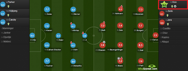 유럽 통계 전문 매체 '후스코어드 닷컴'은 이날 쐐기골을 터뜨린 구자철에게 최고 평점인 9.2점과 함께 MOM을 부여 했다.