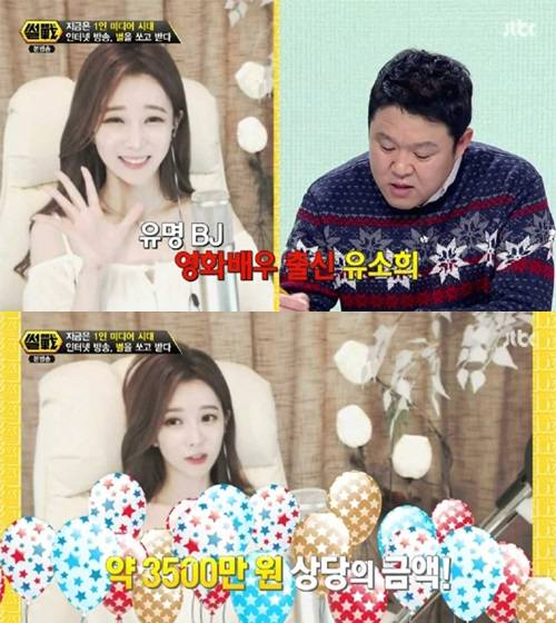 김구라는 "BJ 유소희는 열혈 팬 한 명으로부터 방송 5분 만에 별풍선 35만 개를 받았다. 금액으로 따지면 약 3500만 원 상당이다"라고 밝혔고, 허지웅은 "수수료 및 세금을 뗀 실수령액은 2천만 원 정도라고 하더라"라고 설명해 놀라움을 자아냈다.