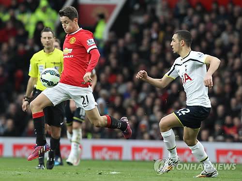 epa04663924 Manchester United's Ander Herrera (L) vies with Tottenham Hotspur's Nabil Bentaleb during their English Premiership League soccer match at the Old Trafford stadium in Manchester, Britain 15 March 2015. EPA/LINDSEY PARNABY DataCo terms and conditions apply http//www.epa.eu/downloads/DataCo-TCs.pdf