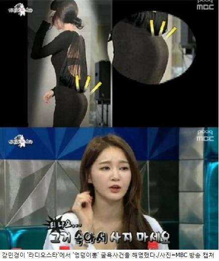 이에 강민경은 "당시 몸에 딱 붙는 의상을 입어서 배를 누르는 보정 속옷을 입었다. 그런데 코르셋에 (엉덩이)패드가 달려있었다"며 "당시 카메라 플래시가 터지니깐 그 보형물이 보였던것"이라고 전했다.
