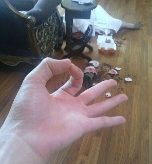 게시된 사진엔 여성으로 보이는 한 사람이 흰옷을 입고 거실 바닥에 쓰러져 있었습니다. 여성의 머리 주변에는 붉은 액체도 흐트러져 있었고, 그 옆엔 치킨 조각과 깨진 화분으로 보이는 물건들이 널려 있었습니다. 물론 일베 인증 손동작이 보이게 하는 걸 잊지 않았습니다.