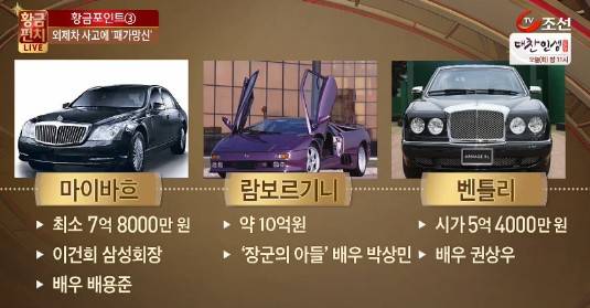 방송에 따르면 '욘사마' 배용준은 가격이 6~7억원에 달하는 마이바흐를 탄다. 이 차량은 삼성 이건희 회장의 차량이기도 하다. 영화 '장군의 아들'에 출연한 배우 박상민 10억원에 이르는 람보르기니를, 장동건은 포르쉐 카레라를 소유한 것으로 전해졌다.