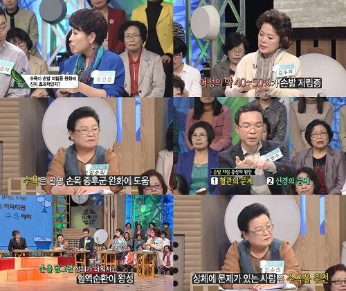 또 발 관리 전문가 김수자 멘토는 "수욕 후, 팔꿈치를 물에 담글 때 집에 흔히 있는 우거지나 배춧잎도 물에 담가둔다. 그리고 충분히 불린 우거지와 배춧잎을 이용해 팔꿈치 부위를 문질러 각질 제거를 할 수 있다"며, "수욕은 주부들의 고질병인 손발 저림 외에 불면증에도 도움을 준다. 누웠는데 잠이 안 오거나 폐경 이후 신체 리듬이 깨진 경우 따뜻한 물에 손을 담그고 있으면 빠른 숙면에 도움을 준다"는 깨알팁도 전했다. 방송은 22일 일요일 밤 11시.