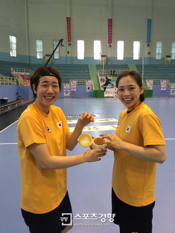 여자 핸드볼 대표팀의 배민희와 정유라도 20일 인도네시 자카르타 아시아 선수권대회 기간 중 훈련에서 워밍업을 마친 뒤 손에 레진을 바른 뒤 공을 집어들었다.
