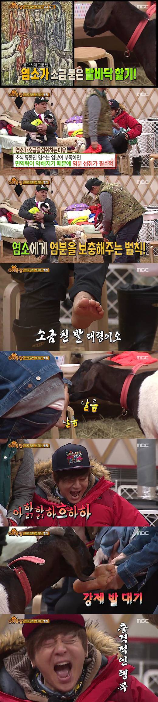 [마이데일리 = 이승록 기자] MBC '일밤-애니멀즈'의 'OK목장' 코너에서 염소가 출연자들의 발바닥을 핥게 하는 황당한 벌칙으로 눈살을 찌푸리게 만들었다.