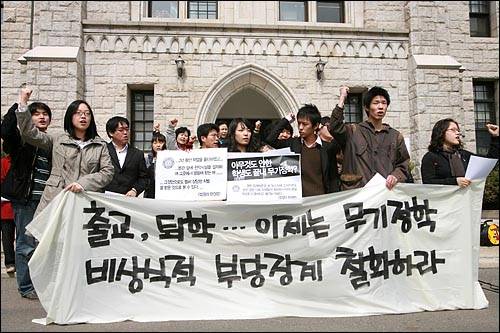 2006년 고려대 당국은 삼성 이건희 회장 명예 철학 박사 학위 수여 항의 시위에 앞장서고 등록금 인상 반대 운동을 주도하는 등 각종 학내 문제에 목소리를 냈던 학생들을 출교했다. 출교는 입학 사실 자체를 말소하는 것으로, 퇴학보다 더 강력한 징계다.