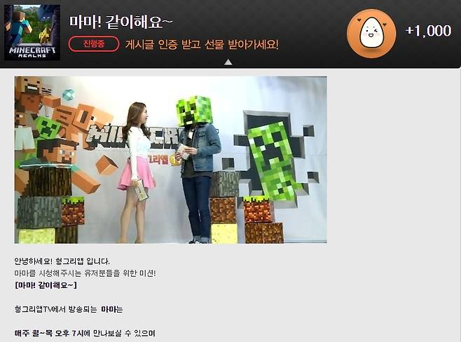 한편, 유저 커뮤니티 '헝그리앱'에서는 헝그리앱TV 인기 프로그램 '마음대로 마인크래프트(이하 마마)의 시청자 참여 이벤트를 진행하고 있다. 이번 이벤트는 '마마 같이해요'로 '마인크래프트 헝그리앱' 커뮤니티 '마마같이해요' 카테고리에 '응원', '하고싶은말', '게임참여 글' 등 자유롭게 게시글을 많이 올리면 추첨을 통해 10명에게 헝그리앱 내의 가상 화폐인 밥알 포인트를 지급한다. 시청자 참여 이벤트는 매주 월요일부터 목요일 19시부터 21시까지 '마마' 방송과 함께 이벤트가 진행되며, 자세한 내용은 '헝그리앱 미션' 또는 '마인크래프트 헝그리앱' 이벤트 공지를 통해 확인 가능하다.