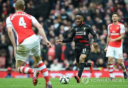 epa04691962 Liverpool's Raheem Sterling in action during the English Premier League soccer match between Arsenal and Liverpool at the Emirates Stadium in London, Britain, 04 April 2015. EPA/ANDY RAIN DataCo terms and conditions apply: http://www.epa.eu/files/Terms%20and%20Conditions/DataCo_Terms_and_Conditions.pdf