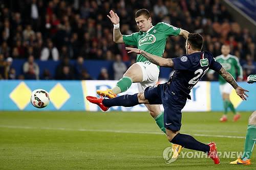epa04696045 Franck Tabanou (L) of AS Saint-Etienne vies for the ball with Ezequiel Lavezzi (R) of Paris Saint Germain during the Coupe de France French Cup semi final match between Paris Saint-Germain (PSG) and AS Saint-Etienne at the Parc des Princes stadium in Paris, France, 08 April 2015. EPA/YOAN VALAT