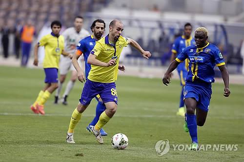 epa04700801 Al-Nassr player Adrian Mierzejewski (L) in action for the ball with Al-Taawon player David Ochieng (R) during the Saudi Professional League soccer match between Al-Nassr and Al-Taawon at King Fahd international Stadium in Riyadh, Saudi Arabia, 11 April 2015. EPA/-