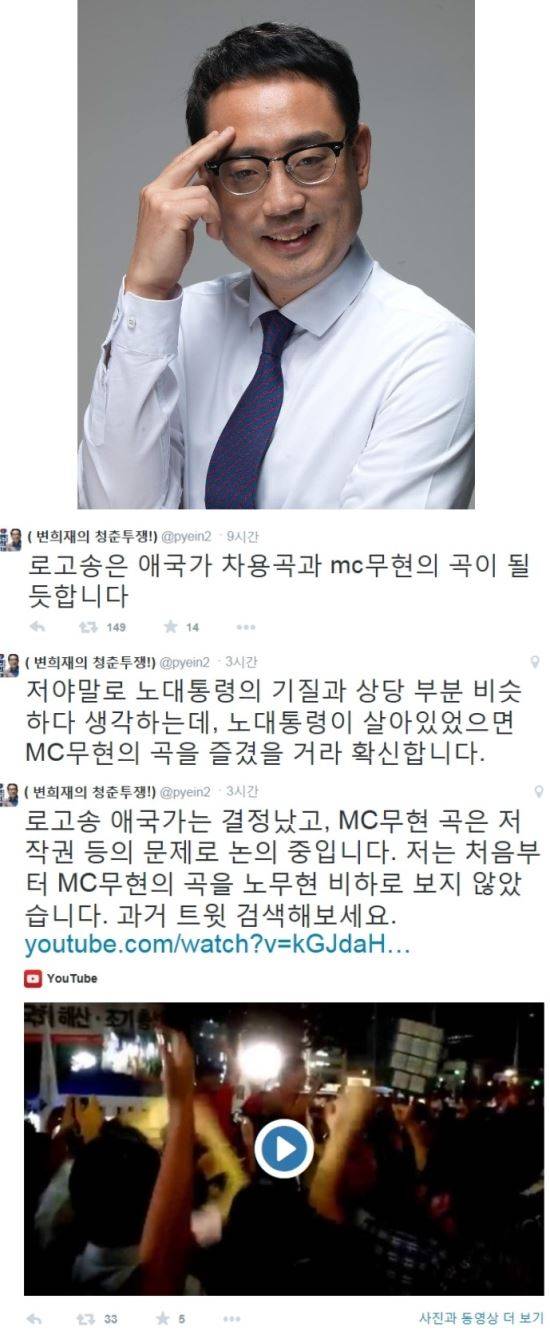 변 후보는 12일 트위터에 "로고송은 애국가 차용곡과 mc무현의 곡이 될 듯합니다"라는 글을 게재했다. 그는 또 "MC무현 곡은 저작권 등의 문제로 논의 중"이라며 "처음부터 MC무현의 곡을 노무현 비하로 보지 않았다. 저야말로 노대통령의 기질과 상당 부분 비슷하다 생각한다"며 "노 대통령이 살아있었으면 MC무현의 곡을 즐겼을 거라 확신한다"고 적기도 했다.
