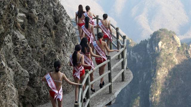 이런 아찔한 고난도 트래킹 코스에 미녀들이 나타났습니다. 모두 아찔한 빨간색 비키니 차림에 아슬아슬한 블랙 킬힐을 신고 말입니다. 국제 비키니 미인 선발대회 중국 화중지역 결선대회였습니다. 결선에 오른 10명의 미녀들은 긴장감, 아니 공포감을 이겨내려는 듯 하나같이 이를 악물고 있었습니다. "어떻게 해서 여기까지 올라왔는데! 이것만 참고 넘기자! 포기란 없어!"