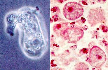 ↑ 파울러 자유아메바의 영양형(왼쪽)과 포낭. 포낭에 있는 핵에 둥그런 핵소체가 크게 두드러져 보이는 것이 특징이다. |