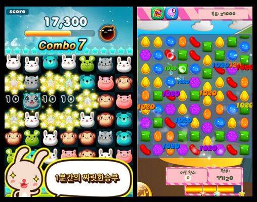 애니팡(왼쪽)과 캔디크러시사가(오른쪽)