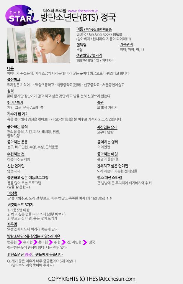 방탄소년단 정국은 최근 ‘더스타’와의 인터뷰와 동시에 진행된 프로필 작성 시간에 고민을 거듭하며 가장 늦게 프로필을 제출했다. 과자를 먹으며 프로필을 꼼꼼히 보던 정국은 유치원 이름을 떠올리며 1차로 시간을 소비, 몇몇 칸을 비워놓으며 고민의 흔적을 보였다.