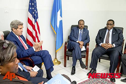 【모가디슈=AP/뉴시스】미국의 존 케리 국무장관(왼쪽)이 5일 소말리아를 방문, 수도 모가디슈 공항에서 하산 모하메드 대통령(가운데) 및 오마르 샤르마르케 총리(오른쪽)와 회담하고 있다. 2015. 5. 5