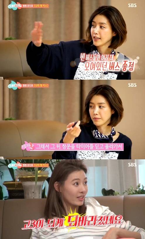 채정안은 "고3 때 빈 버스 안에서 첫키스를 했다"며 "내가 타이어를 딛고 창문을 열어봤더니 버스 창문이 진짜 열리더라"며 "그래서 타이어를 딛고 안으로 들어가 그 친구를 버스 안으로 불렀다"고 고백했다.