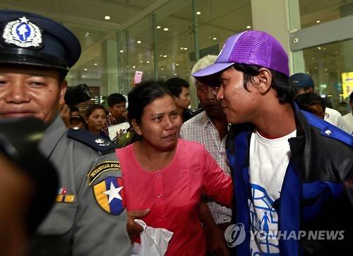 epa04739785 Win Ko Naing (R), Myanmar fishing industry worker alleged to have been working under slave labor conditions greets with his mother as he arrives back to Myanmar from Indonesia, at Yangon International airport, Yangon, Myanmar, 09 May 2015. Fourteen Myanmar nationals working in the fishing industry were flown back to their homeland on a passenger airline, among more than 150 Thai, Myanmar, Cambodian and Laotian nationals who had asked the Thai authorities for help on release from their conditions on fishing vessels or were arrested for illegal fishing by Indonesian authorities. EPA/NYEIN CHAN NAING