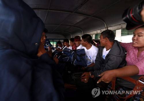 epa04739793 Myanmar fishing industry workers alleged to have been working under slave labor conditions arrive back to Myanmar from Indonesia, at Yangon International airport, Yangon, Myanmar, 09 May 2015. Fourteen Myanmar nationals working in the fishing industry were flown back to their homeland on a passenger airline, among more than 150 Thai, Myanmar, Cambodian and Laotian nationals who had asked the Thai authorities for help on release from their conditions on fishing vessels or were arrested for illegal fishing by Indonesian authorities. EPA/NYEIN CHAN NAING