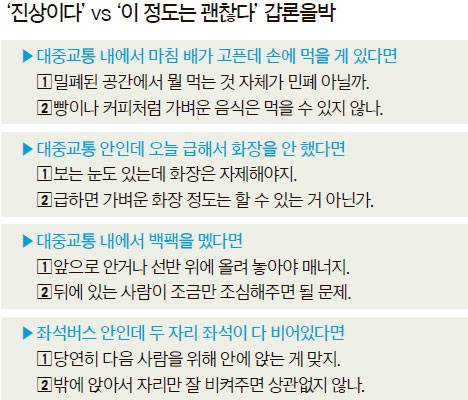 때로는 논쟁이 붙는다. 요즘 불거지고 있는 건 ‘버스 자리 선택’이다. 버스 안에는 두 사람이 같이 앉을 수 있는 2인용 좌석이 있는데 이 좌석이 비어있을 때 안 좌석과 바깥 좌석 중 어디에 앉느냐의 문제다. 김진남(40·서울 공덕동)씨는 “바로 내릴 게 아니라면 당연히 안에 앉는 게 다음 사람을 위한 매너”라고 말했다. 반면 정윤신(32·서울 금호동)씨는 “내리기 쉬워 바깥 자리를 선호하는데 사람이 왔을 때 다리를 살짝 비켜주면 그만”이라고 말한다. 버스 자리 선택 말고도 다툴 건 많다. 백팩을 즐겨 메는 사람들은 “가방도 내 마음대로 못 메는 거냐”며 반발하고, ‘대중교통 내에서 음식물은 어디까지 섭취할 수 있나’를 두고도 의견이 나뉜다.