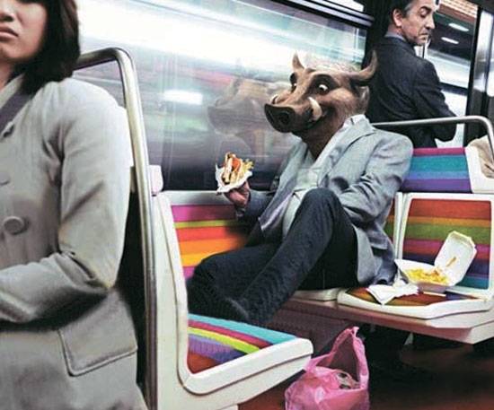 프랑스 파리 지하철을 운영하는 파리교통공사(RATP)는 지하철에서 꼭 지켜야 할 에티켓을 선별해 캠페인 광고를 만들었다. 광고 포스터는 지하철 의자에 앉아 햄버거를 먹고 있는 사람을 ‘멧돼지’로, 커다란 백팩을 맨 채 주변 승객에게 피해를 주는 사람의 머리는 ‘거북이’로 묘사했다. 사람이 내리기도 전에 지하철에 타려는 사람은 ‘물소의 머리’로 풍자했다. 그리고 ‘지하철 전 라인에서 시민 의식을 지킵시다’라는 문구를 삽입했다.