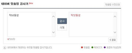 포털 사이트 네이버는 검색창에 맞춤법 검사기라고 치면 바로 창이 나오며, 맞춤법을 시작으로 띄어쓰기, 표준어 의심단어 등이 다른 색상으로 표기된다.