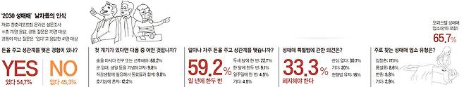 ‘청춘의 성매매’는 현실이다. 본지가 20~30대 남성 75명을 대상으로 설문조사한 결과 절반이 넘는 남성(41명)이 “성매매 경험이 있다”고 답했다. 이들 중 절반가량은 20대 초반(25세 이전)에 처음 돈을 주고 성관계를 맺었다.