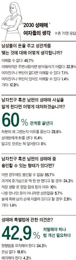 ‘남사친’들의 만류에도 이씨는 결국 남자친구와 헤어지기로 했다. “성매매 사실을 알고 나선 도저히 만나기 힘들다”며 이별을 통보했다고 한다. 본지가 조사한 20~30대 여성 70명 중 다수의 의견과도 같다. 남자친구 혹은 남편의 성매매 사실을 알게 된다면 ‘관계를 끝내겠다’고 응답한 비율이 60%에 달했다.