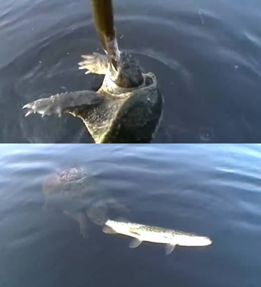 영상을 보면, 낚시꾼이 낚싯대를 들어 올리자 노던 파이크(northern pike, 강꼬치고기)와 함께 늑대거북 한 마리가 모습을 드러낸다. 늑대거북은 좀처럼 물고기를 놓아주지 않으며 한동안 승강이를 벌인다.