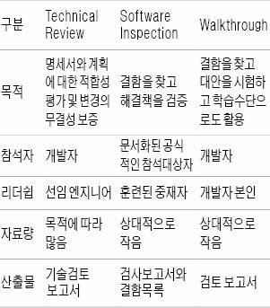 (2) 기술검토(Technical Review), 소프트웨어 검사(Software Inspection), 워크스루(Walkthrough) 등이 있다.