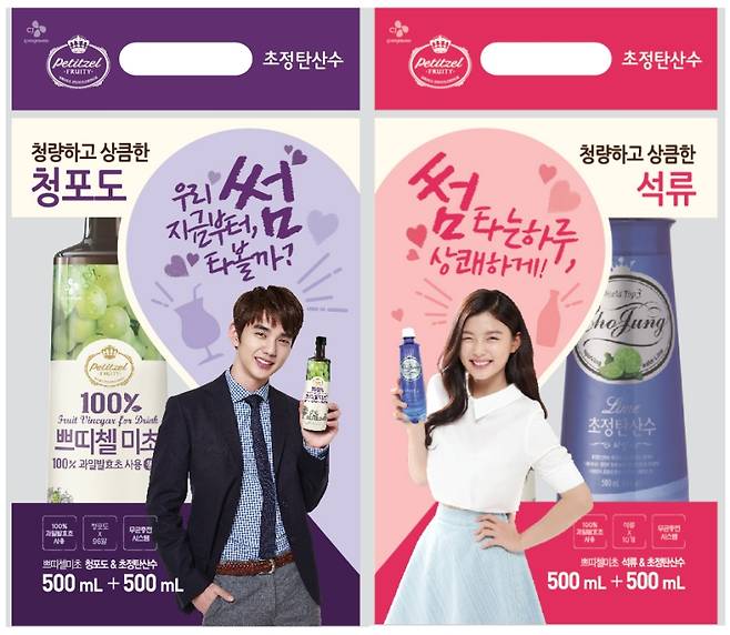 CJ제일제당의 100% 과일발효 음용식초 '쁘띠첼 미초'가 일화의 웰빙 탄산수 브랜드 '초정탄산수'와 손잡고 협업 마케팅을 진행한다.