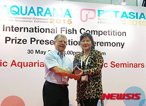 【아산=뉴시스】이종익 기자 = 순천향대학교는 입주기업인 ㈜한국생물보전연구소(대표 박상용)가 최근 싱가포르에서 열린 '아쿠아라마2015'의 관상어 경쟁부문(International Fish Competition)에서 한국 고유 토종어류인 '각시붕어'를 출품해 한국 최초로 3위에 입상했다고 10일 밝혔다.아쿠아라마(AQUARAMA)는 세계 최대 규모의 유일한 'Aqua pet' 박람회로서 싱가포르에서 2년마다 개최되며 오랜 전통을 지닌 해수·담수 관상생물과 관련된 수족관 용품이 전시돼 경쟁하는 올림픽과 같다.