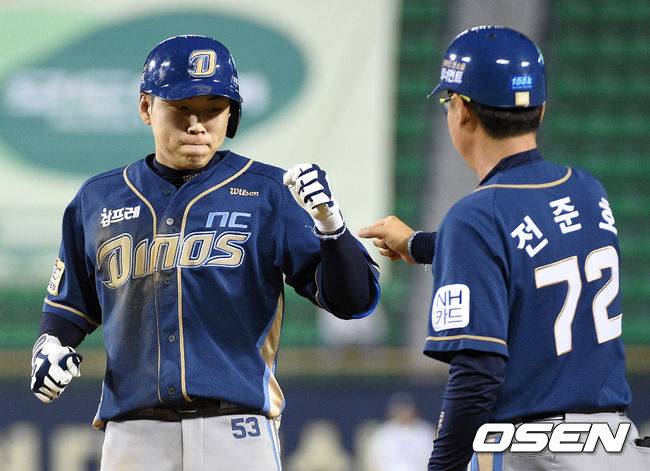8회초 2사 만루에서 NC 최재원이 좌중간을 가르는 2타점 적시타를 치고 전준호 코치와 하이파이브를 하고 있다.
