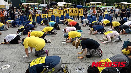 【서울=뉴시스】박주성 기자 = 13일 오후 서울 광화문광장에 도착한 세월호 유족 3보1배단이 마지막으로 세월호 희생자 아이들에게 100배를 하고 있다.