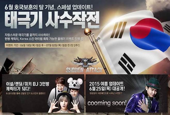 넥슨(대표 박지원)은 넥슨지티(대표 김정준)가 개발하고 자사에서 서비스 중인 FPS 온라인게임 서든어택에 신규 게임모드 '태극기 사수작전'의 업데이트를 실시했다고 금일(18일) 밝혔다.'태극기 사수작전'은 6월 호국보훈의 달을 기념해 새롭게 추가된 서브미션 모드로, 맵 중앙에 있는 태극기를 획득, 게임이 끝날 때까지 사수하는 팀이 승리하는 방식이다.넥슨은 신규 모드 업데이트를 기념해 오는 7월 2일까지 '태극기 사수작전'을 클랜전으로 10회 플레이하는 게이머에게 '순국선열' 칭호와 5만 경험치를 지급하며, 맵 숙련도 50레벨을 달성할 경우 신규 '헌병캐릭터세트'를, 게임을 1회 플레이할 때마다 '코리아 스킨 무기'를 선물하는 이벤트도 실시한다.이와 함께, 서든어택에서 BJ로 활동 중인 BJ랜딩, BJ미키와 서든어택 방송 SATV의 'BJ 캐릭터 오디션'에서 우승을 차지한 BJ이설 등 3인의 캐릭터도 추가됐다. 이번 캐릭터는 BJ 3인의 의견을 적극적으로 반영해 BJ랜딩은 근육질 몸매, BJ미키는 젠틀한 신사, BJ이설은 섹시하면서도 귀여운 모습으로 완성됐고, 각각 랩 하기, 자랑하기, 경운기 댄스 등 감정표현 및 캐릭터 기능을 제공한다.아울러 넥슨은 오는 7월 2일까지 BJ 3인 캐릭터 퍼즐을 모아 퍼즐판을 완성하는 선착순 500명의 게이머에게 'BJ 3인과 함께하는 오프라인 행사' 참석 기회를, 그중 추첨을 통해 10명에게는 'PC방 데이트' 기회도 증정한다. 이후 퍼즐판을 완성하는 게이머들은 '랜딩, 이설, 미키 보이스 아이템', 'BJ 스킨 주 무기'를 모두 받을 수 있다. 같은 기간 캐릭터 사용 기간을 50일 이상 만드는 게이머의 경우 '랜딩', '이설', '미키', 'BJ' 등 유니크 칭호 6종이 주어진다.또한, 오는 6월 19일부터 21일까지 특정 시간에 게임에 접속하는 게이머에겐 인기 주 무기 상자와 버닝부스터를 증정하며, 게임 접속 시간에 따른 게이지를 모두 채우면 최대 10만 경험치를 지급한다. 마지막으로 오는 6월 25일까지 특정 시간에 접속한 게이머는 'M4A1(ISR)Angel', 'CM901(IS)심플' 등 주 무기 5종을 자유롭게 사용할 수 있다.한편, 넥슨은 서든어택 10주년 맞이 2015년 여름 업데이트를 앞두고 지난 6월 15일 홈페이지를 통해 코믹 티저 영상을 선보였고, 오는 6월 25일 업데이트 내용을 공개할 예정이다.이에 대한 자세한 내용은 서든어택 홈페이지(http://sa.nexon.com)에서 확인할 수 있다.