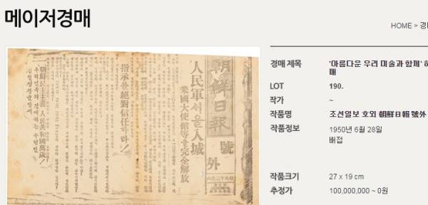 조선일보 1950년 6월 28일자 호외가 경매시장에 나왔다. 경매 사이트 '옥션단'(AUCTION DAN)은 오는 24일 서울시 인사동에서 조선일보 호외(원본)를 경매한다고 밝혔다. 19일 현재 추정가는 1억으로 올라와있다. 김영복 옥션단 대표는 "일주일 전 쯤 경매 품목으로 올라왔다"며 "누가 올렸는지는 알려드릴 수 없다"고 밝혔다.