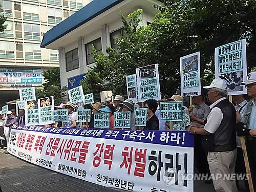 (서울=연합뉴스) 설승은 기자 = 대한민국어버이연합과 경우회, 교학연 등 보수성향 단체는 22일 오후 서울 종로경찰서 앞에서 기자회견을 열어 "세월호 불법 시위를 주도한 416연대를 구속하는 등 엄정하게 수사하라"고 주장했다.