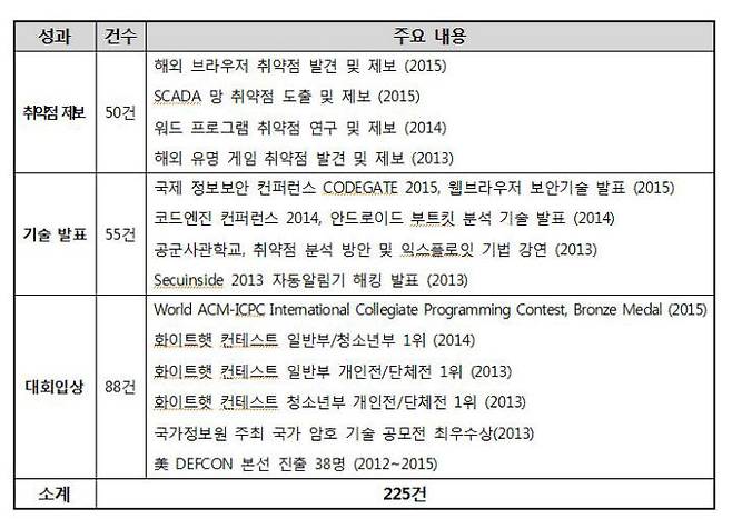 BoB 학생들은 POS기나 각종 IoT기기, 워드 프로그램, 게임, TV 셋톱박스, 무선공유기, 금융 관련 앱 등을 대상으로 취약점 분석 연구로 성과를 냈다. 수료생들은 어린 나이에도 총 22건 논문 발표했다. 이 중 2건이 최우수상과 우수 논문상을 받았다.