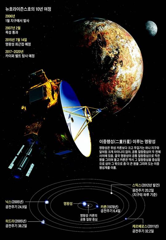 미 항공우주국(NASA)의 무인 탐사선 '뉴호라이즌스(New Horizons)'호가 지구를 출발한 것은 2006월 1월 19일이었다. 그로부터 9년 반, 뉴호라이즌스호가 드디어 목적지인 명왕성(冥王星)에 가까이 접근하고 있다. 그 사이 많은 것이 변했다. 명왕성은 행성(行星)의 지위를 잃고 왜소 행성(矮小行星·dwarf planet)이 되었다. 하지만 명왕성은 여전히 이해하기 힘든 미지의 세계이고, 태양계의 비밀을 풀려면 꼭 밝혀내야만 할 숙제이다. 명왕성은 왜 행성에서 퇴출됐을까. 뉴호라이즌스호가 밝혀내고자 하는 것은 무엇일까.