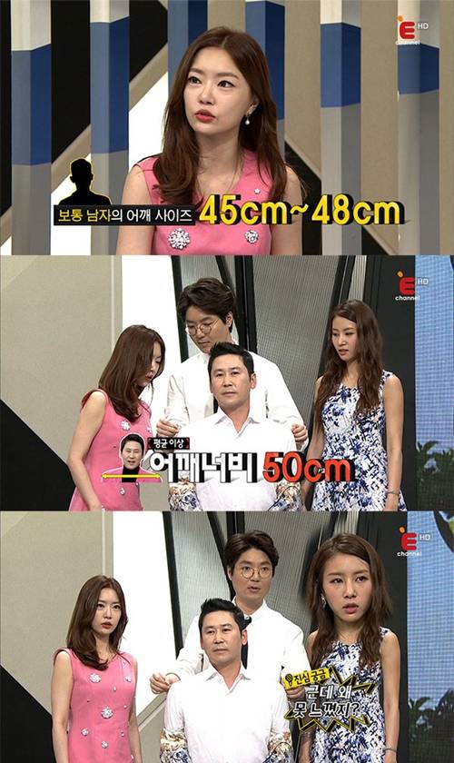 이에 패널들은 직접 줄자를 가지고 신동엽의 어깨 넓이를 측정했다. 신동엽은 처음 측정시 52cm, 겉옷을 벗었을 때 50cm로 측정돼 배우 김우빈과 유사한 넓은 어깨 넓이로 밝혀져 모두를 깜짝 놀라게 했다. 직접 길이를 재본 김정민은 "근데 왜 못 느꼈지?"라고 의구심을 드러내 웃음을 자아냈다.