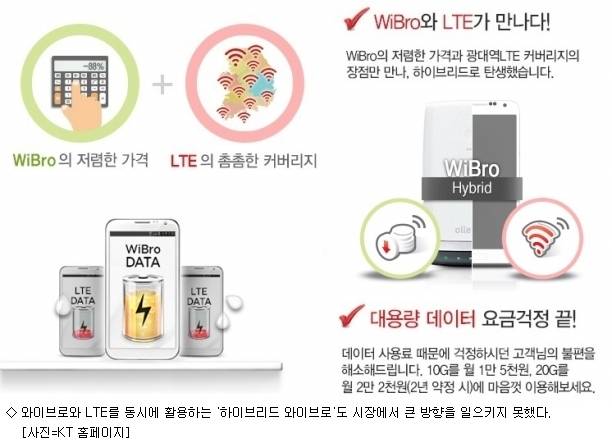 지난해 KT가 와이브로와 LTE를 동시에 사용할 수 있는 '하이브리드 에그' 상품을 출시하긴 했지만 큰 반향을 일으키지 못했다. KT와 함께 와이브로를 서비스하고 있는 SK텔레콤도 최근 2년간 와이브로 상품을 전혀 출시하지 않고 있는 상황이다.