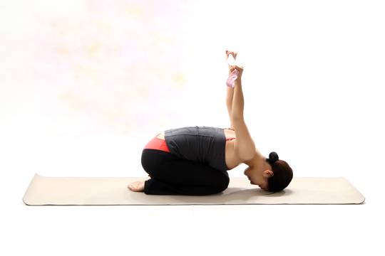 숨을 내쉬면서 상체를 앞으로 숙여 이마를 바닥에 놓고, 두 손은 천장을 향해 들어올린다. 깍지를 천장을 향해 밀어내면서 어깨가 귀에서 점점 멀어지도록 한다.