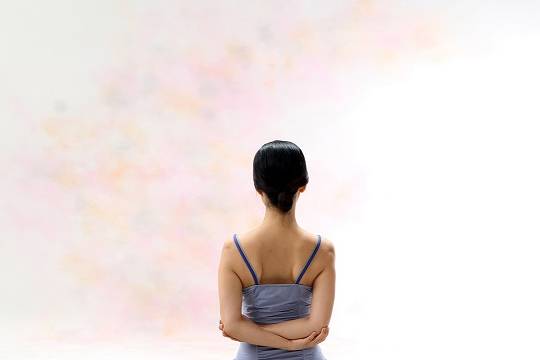 등 뒤로 양 팔꿈치를 맞잡는다. 숨을 들이쉬고, 내쉬면서 양 팔꿈치를 안으로 끌어당긴다.