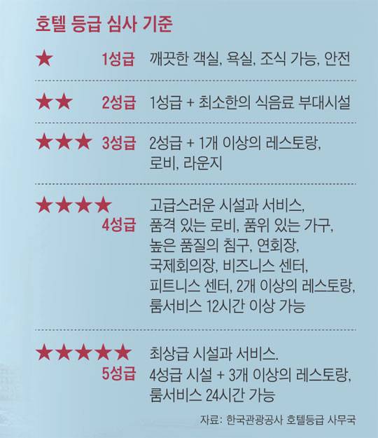 호텔 등급은 숙박료, 서비스 수준을 반영한다. 소비자에게 중요한 판단 기준이 되기 때문에 등급 심사는 법적인 의무다. 전국 모든 호텔은 3년에 한 번 심사를 받아야 한다. 2일 현재 심사 대상 호텔은 전국 760곳이다. 자치도인 제주도만 자체적으로 평가한다.