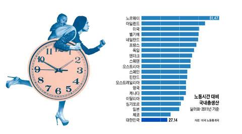 미국 노동통계국 자료를 보면 각 국가의 국내총생산(GDP)을 노동 시간으로 나눠 시간당 생산성을 계산한 것이 있습니다. 30일 유급 휴가를 가고 충분한 휴식을 보장하는 노르웨이의 생산성이 가장 높습니다. 세계에서 가장 노동시간 길기로 유명한 한국은 꼴찌네요. 미국인은 프랑스인이 게으르다고 조롱하지만 두 국가의 생산성은 큰 차이가 없습니다. 프랑스 사람들은 점심 먹으러 늘 카페로 나가고 휴가 땐 누가 뭐라든 사라져 버리지만, 일할 땐 바짝 조여 일합니다. 여가는 절대적으로 많은데 일단 일을 시작하면 철저하게 집중해요. 그리고 놀라운 생산성을 보여주는 것이지요.