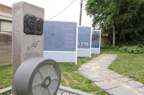 | ▲ 윤상원과 박기순의 얼굴이 새겨진 기념비. 윤상원 열사의 생가에 설치돼 있다. |
